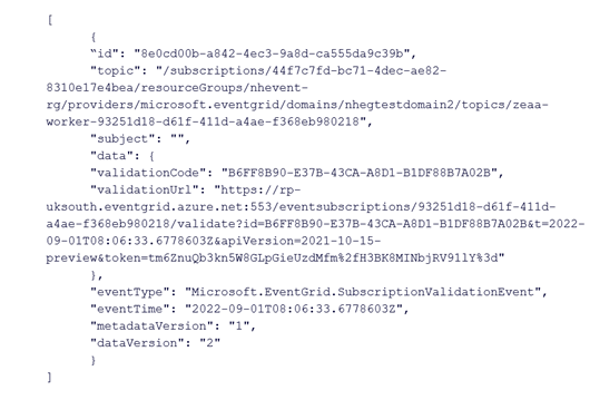 Upon receiving a subscription request from an authorised client, Notification Hub registers the webhook on Event Grid as a topic, which is a collection of related events. Customers (subscribers) can decide which topics to subscribe to. The following is an example response when subscribing to a topic: